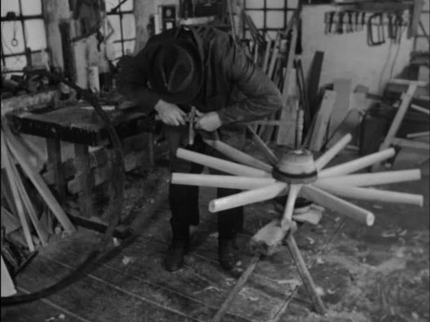 The film shows the different stages in the manufacture of a large cart-wheel and the special tools used by the wheel-wright: turning the hub, shaping the…